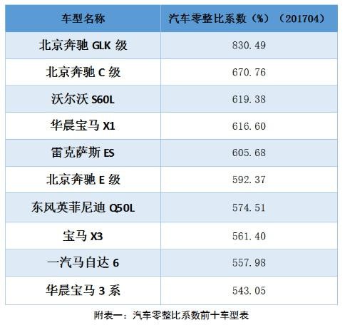 汽車零整比系數方面,通過公開市場采集各車型的配件價格(價格數據截至到3月),導入計算公式核算各車型的汽車零整比系數。在樣本車型中最高的車型為北京奔馳GLK級,汽車零整比系數為830.49%;最低的車型為力帆620,汽車零整比系數為157.66%。
