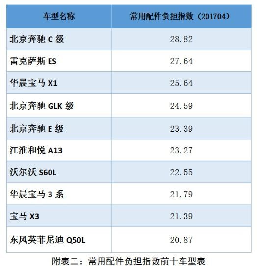 常用配件負擔指數方面,在汽車零整比系數基礎上,挖掘事故車維修數據,選取配件損失率大于1%的常用配件進行研究,導入計算公式核算各車型的常用配件負擔指數。在樣本車型中最高的車型為北京奔馳C級,常用配件負擔指數為28.82;最低的車型為哈弗H6,常用配件負擔指數為9.32。