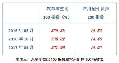 綜上所述,部分高端進口品牌車型的汽車零整比系數和常用配件負擔指數仍居高位。近三期汽車零整比100指數呈小幅下降趨勢,常用配件負擔100指數略有上漲。